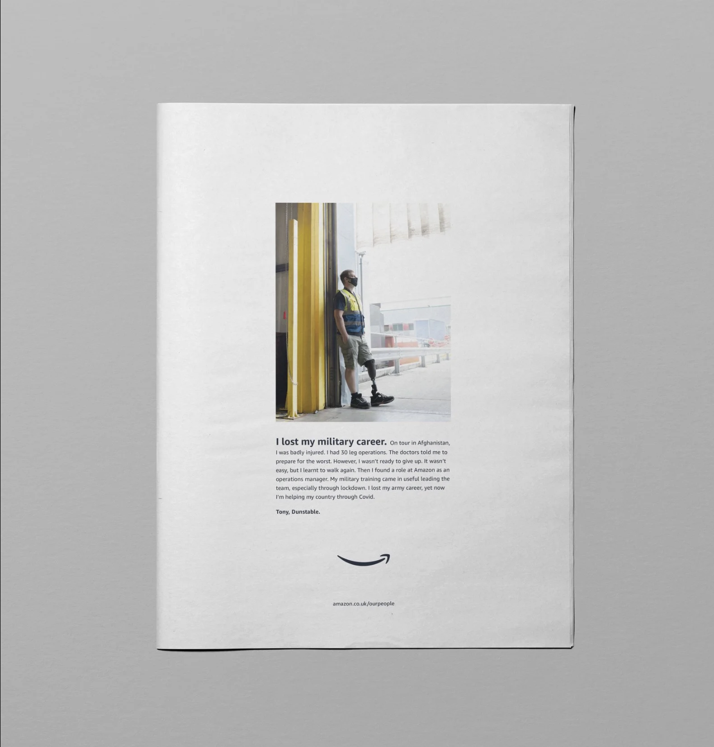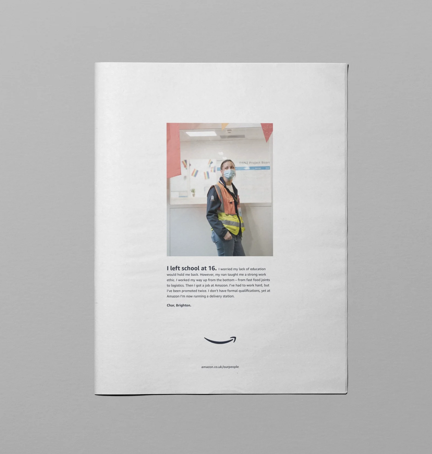 As part of the This is Amazon campaign, I art directed TV and print executions centred on authentic employee stories. A film followed Camila’s journey as a Mechatronics Engineering apprentice, while the print campaign featured portraits and first-person testimonials from fulfilment centre workers.
